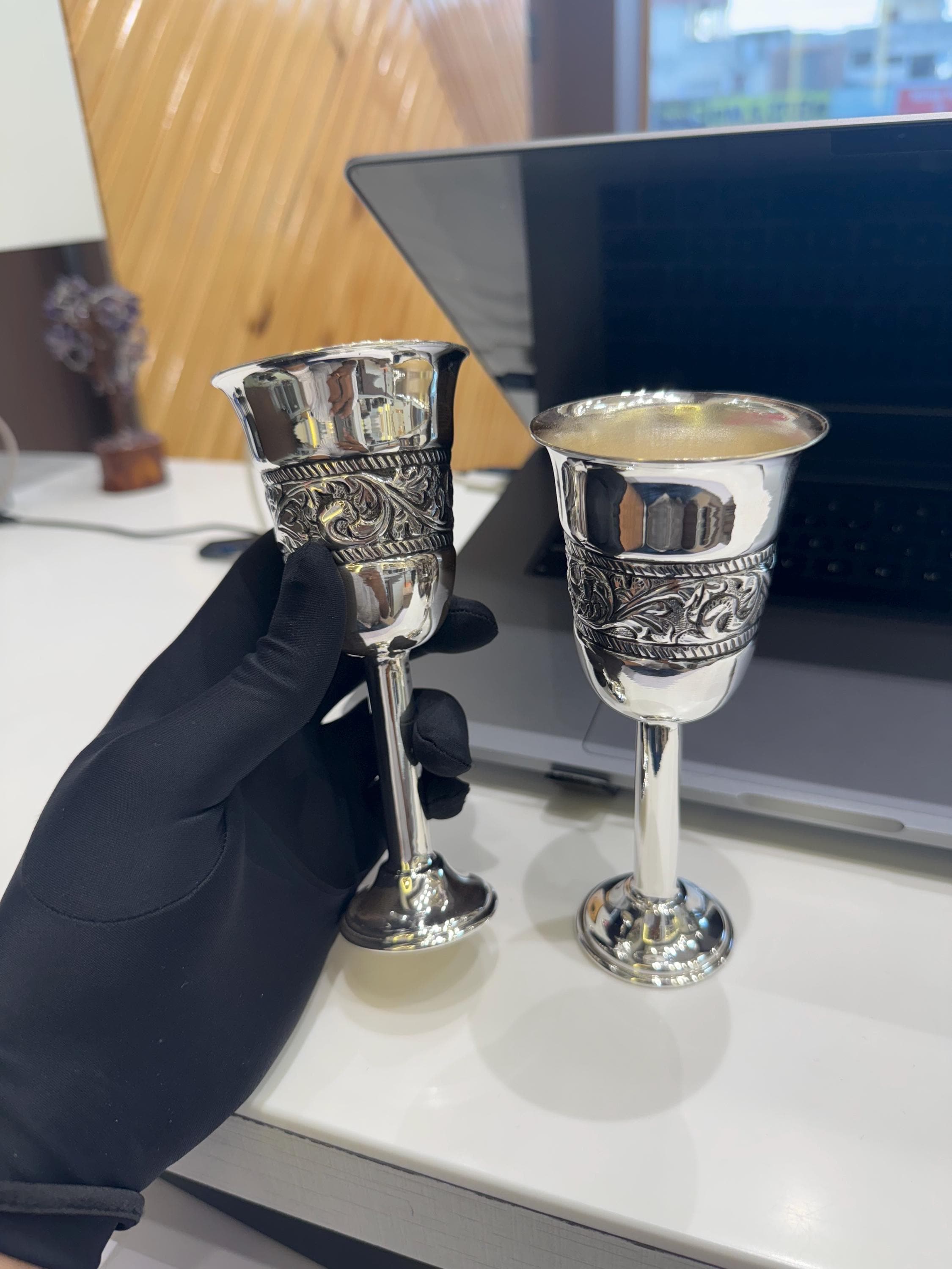 Bring timeless elegance to your table with these handcrafted pure silver glasses, designed in a classic goblet style with intricate antique floral detailing.