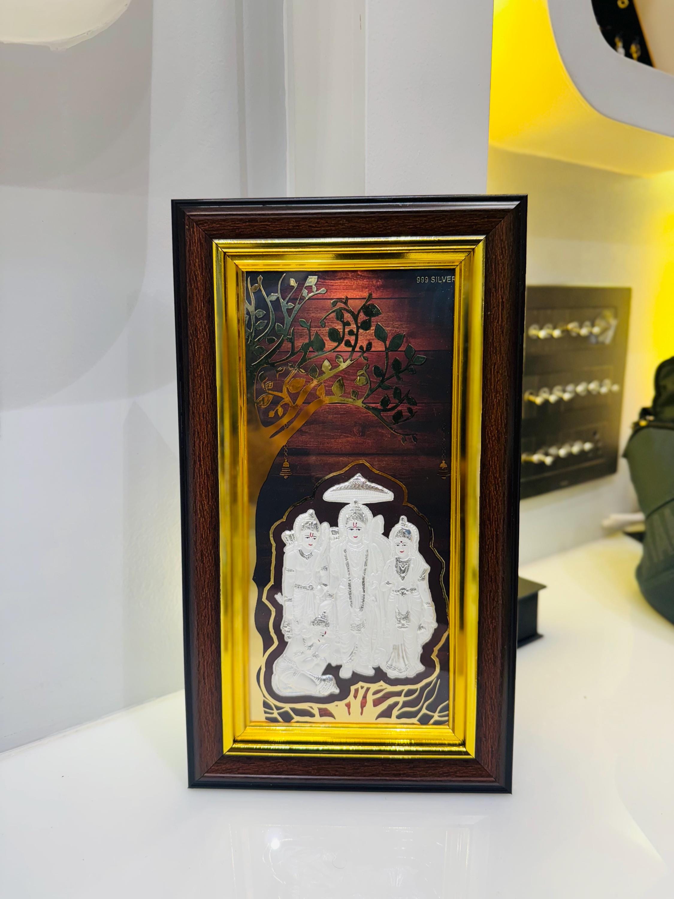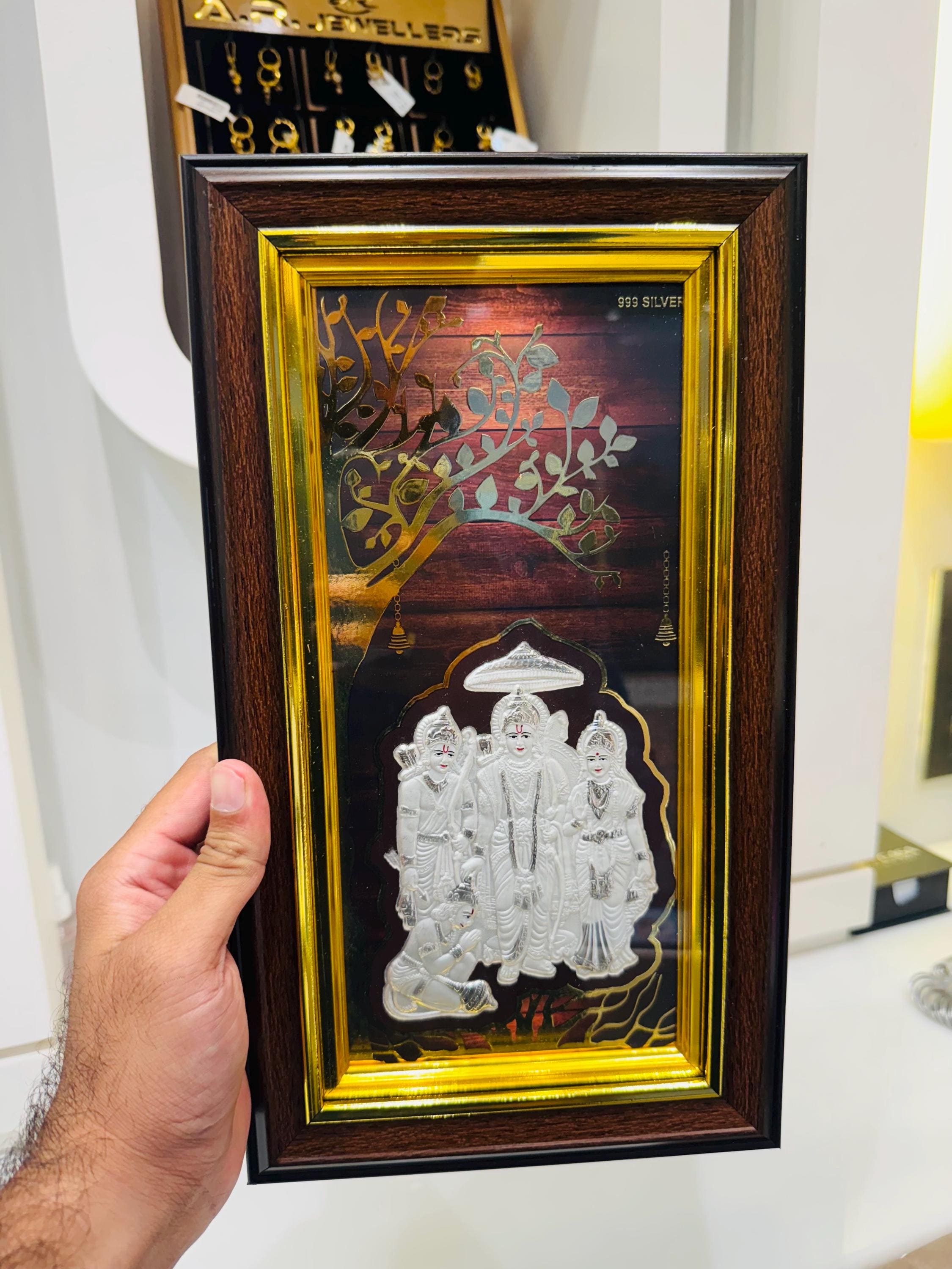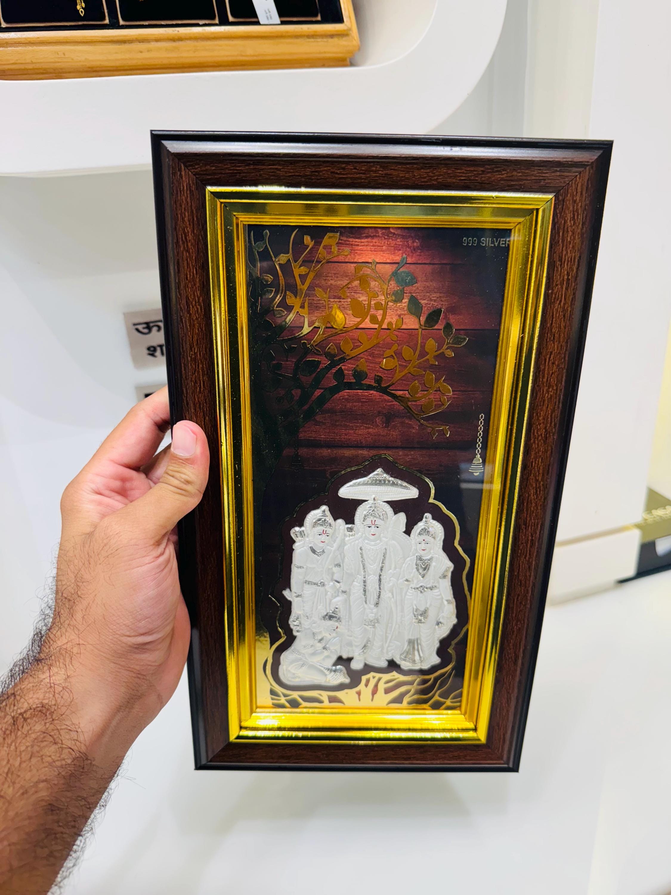 Expertly crafted with pure silver foil and a premium wooden frame with a golden border, this elegant piece radiates devotion and luxury — perfect for temples, living rooms, offices, or as a thoughtful gift for any spiritual occasion.