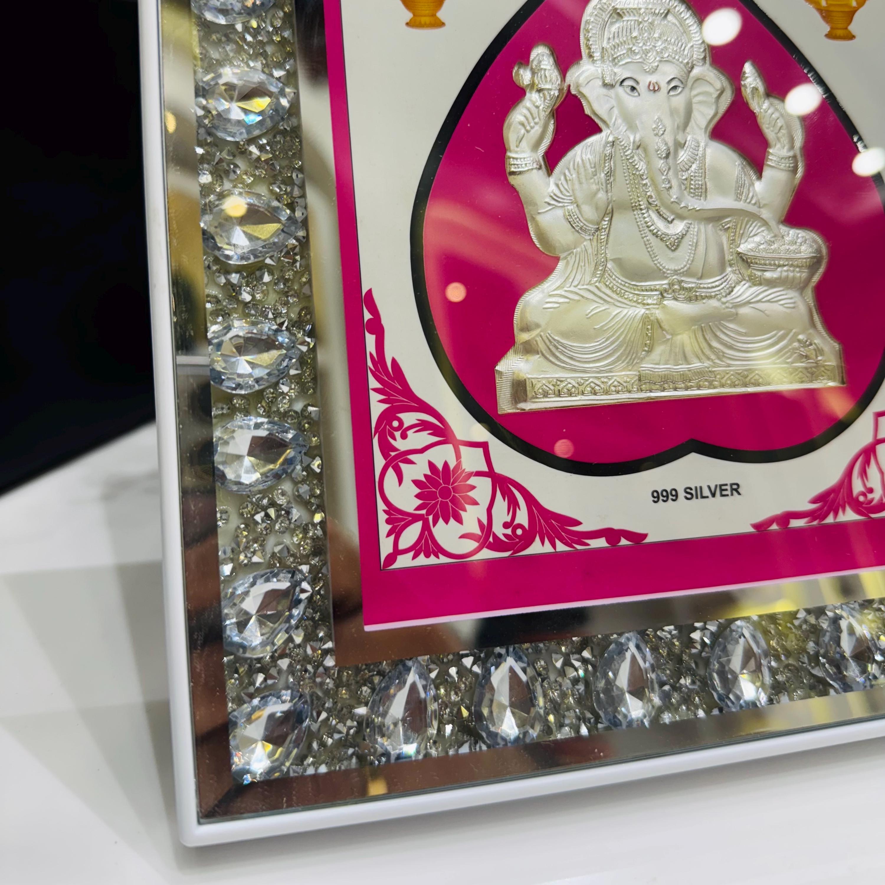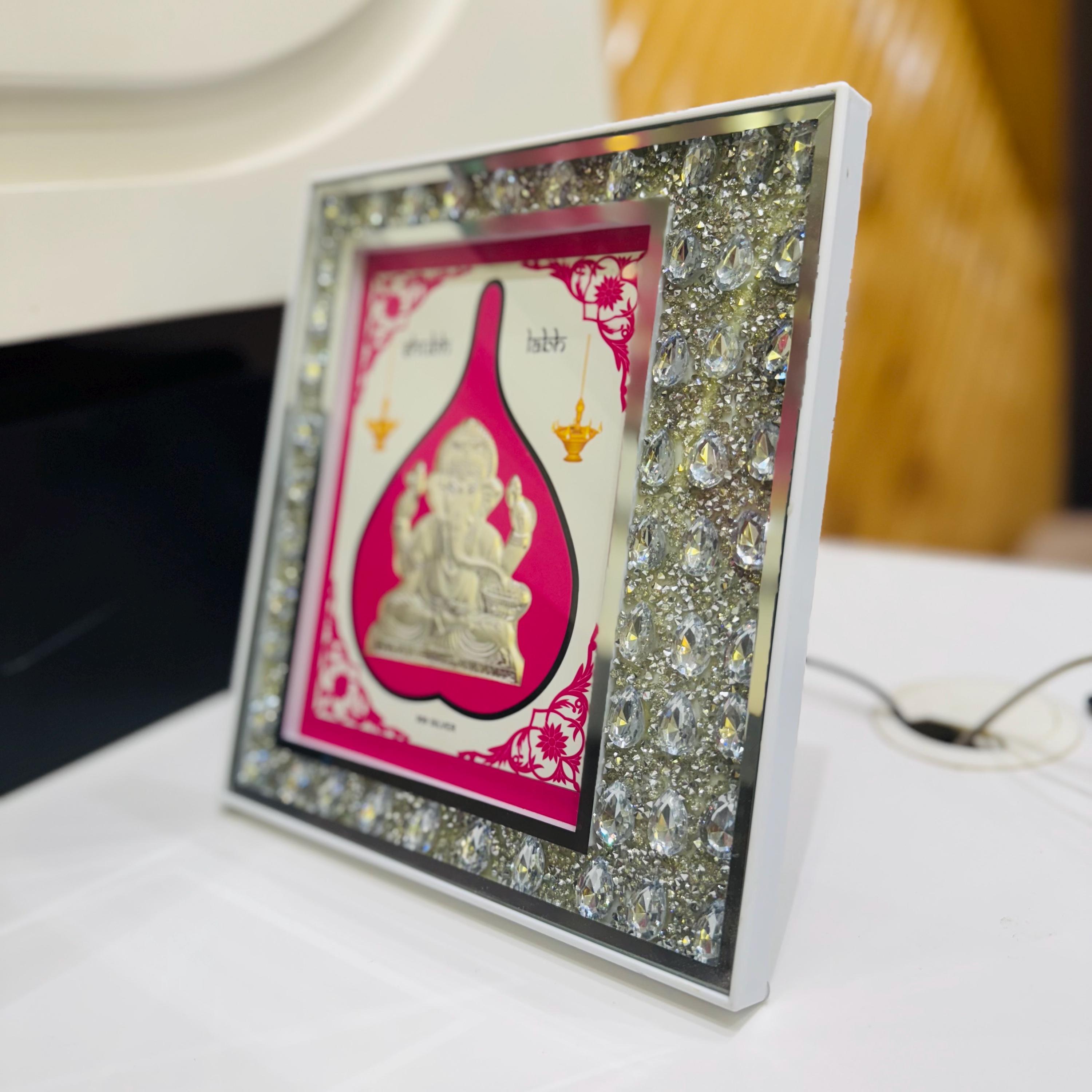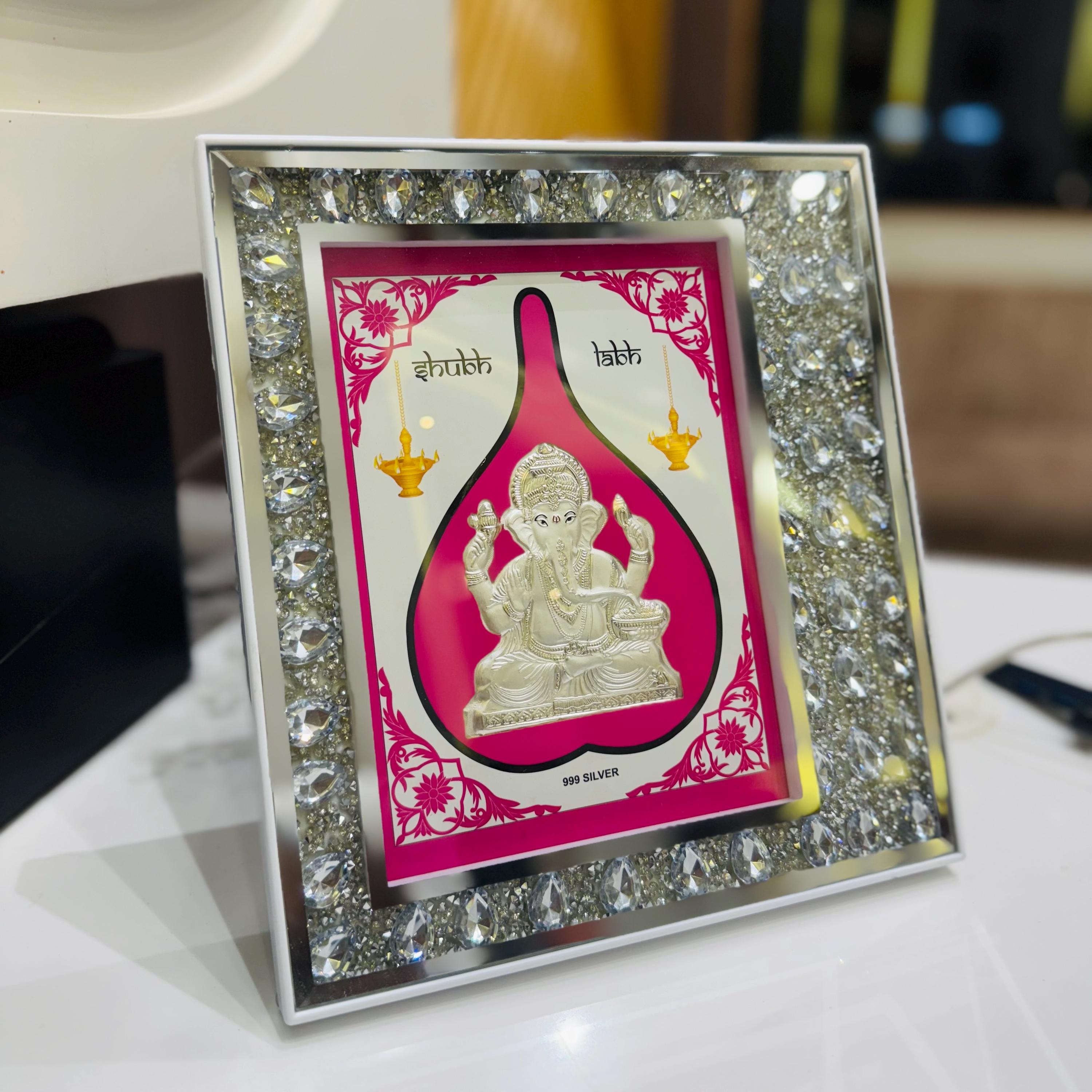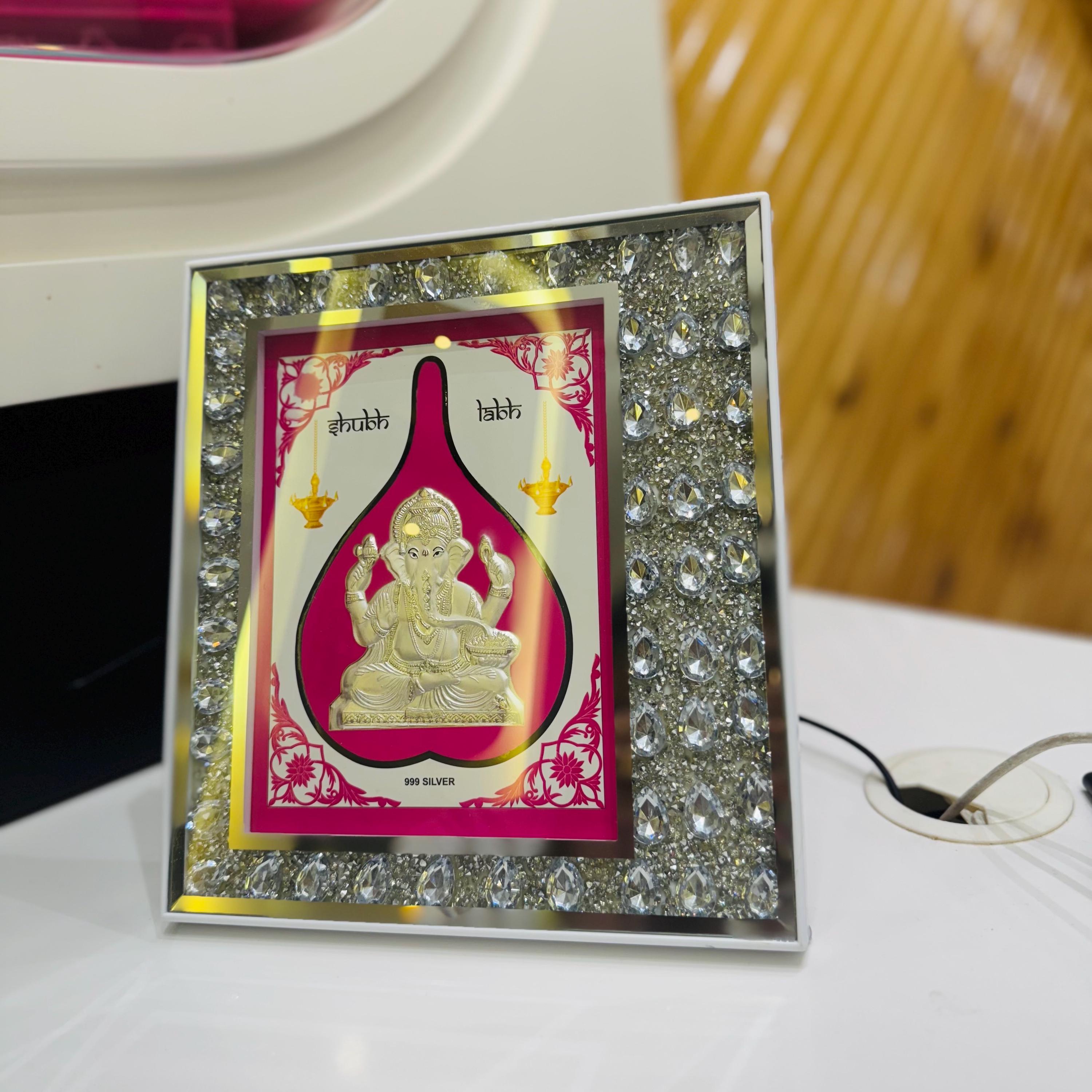 999 Silver Ganesha Frame | Shubh Labh Table Decor | Crystal Border Ganpati Photo Frame