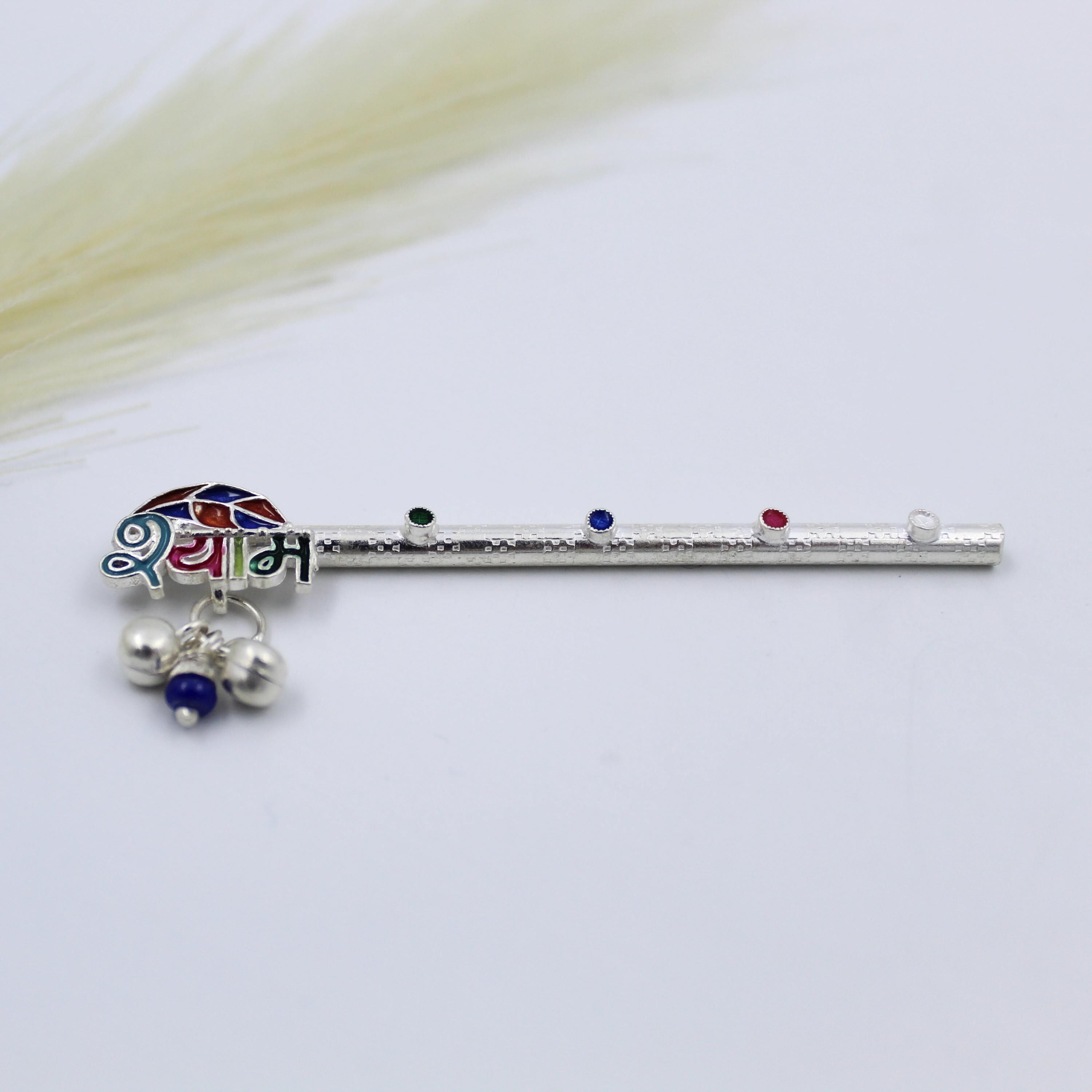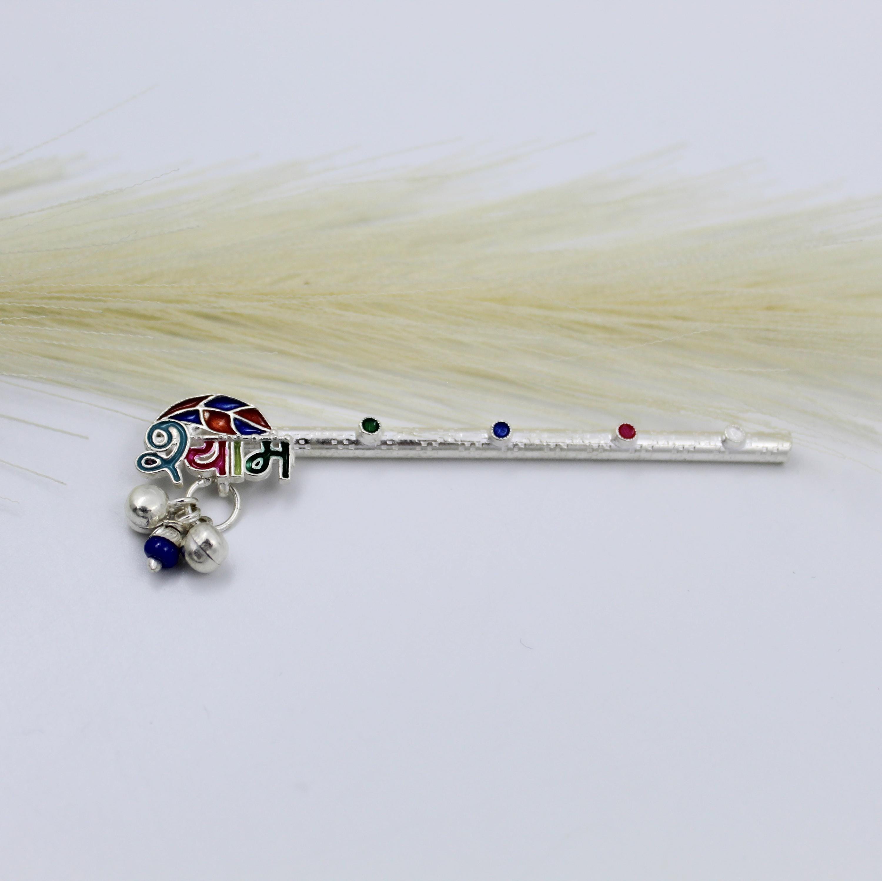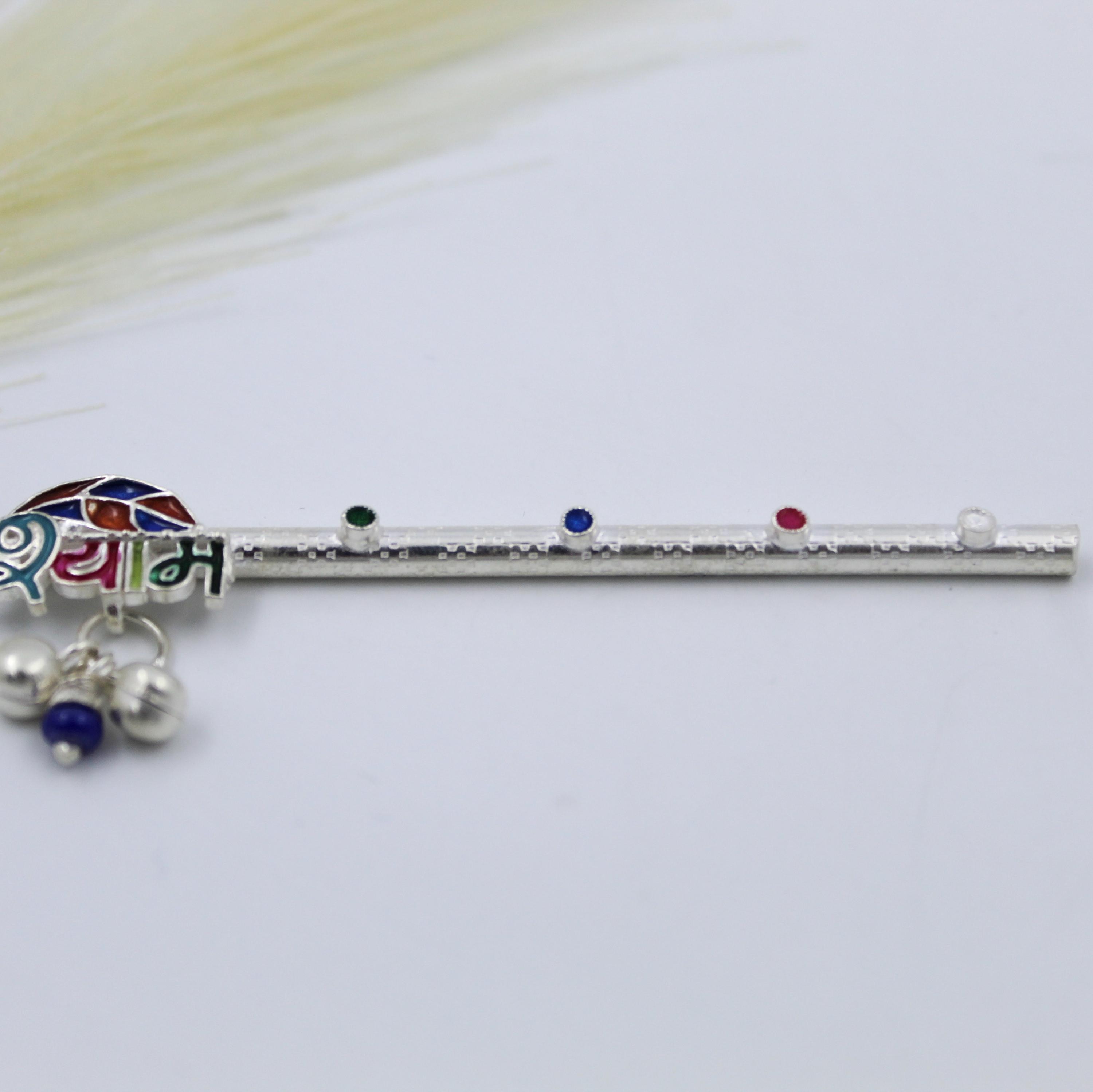 Invite the serene melody of devotion into your sacred space with this exquisite pure silver Krishna Murli flute, adorned with vibrant Meena work that captures the essence of spiritual artistry. Each flute is meticulously handcrafted from 99.9% pure silver, blending traditional craftsmanship with colorful Meenakari design to create a truly unique silver Krishna decor piece. Perfect for enhancing your pooja room or gifting during special spiritual occasions, this artisan silver murli embodies divine love and cultural heritage.