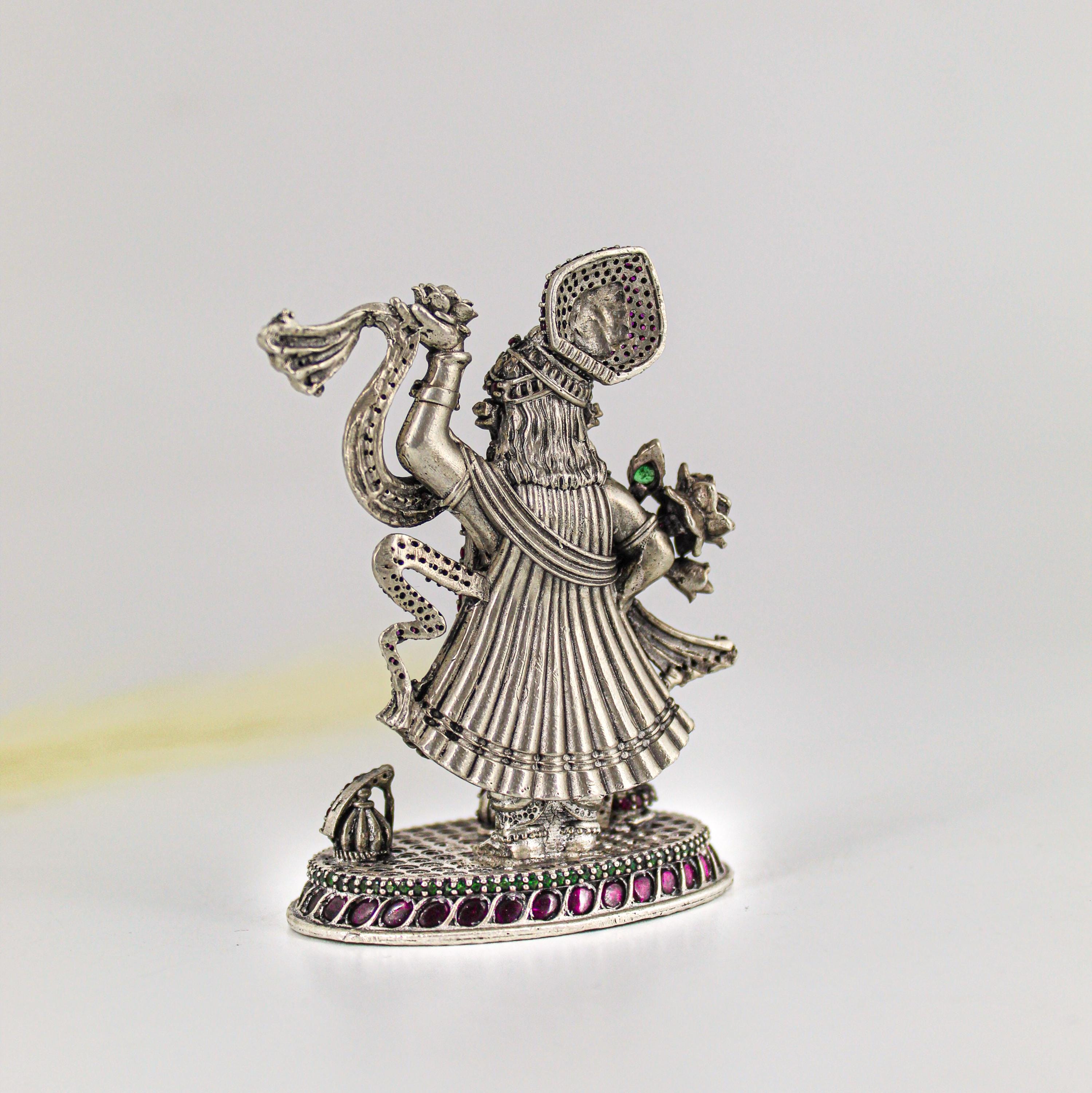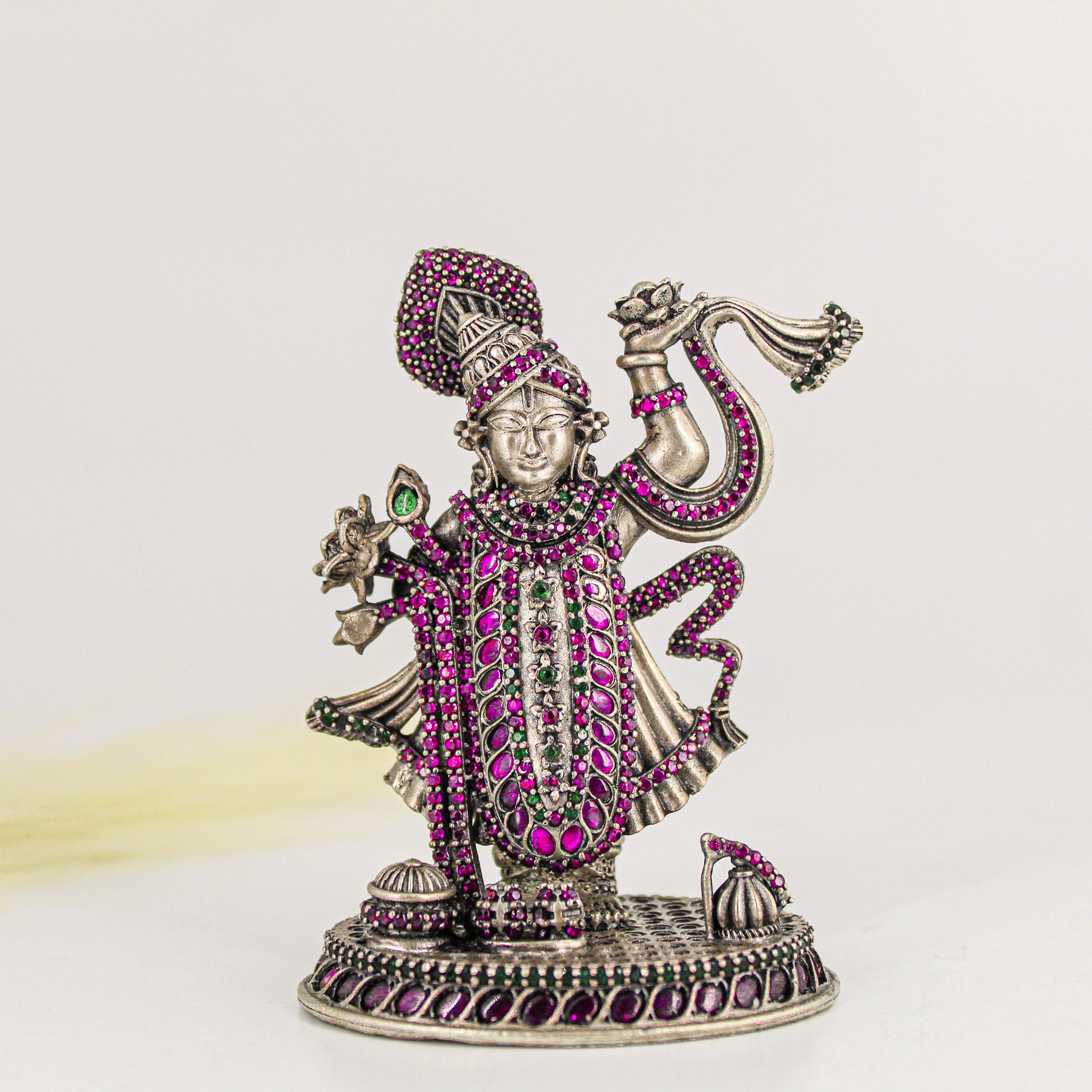 Krishna Idol, Silver-Tone with Pink Stones (Handcrafted Figurine)