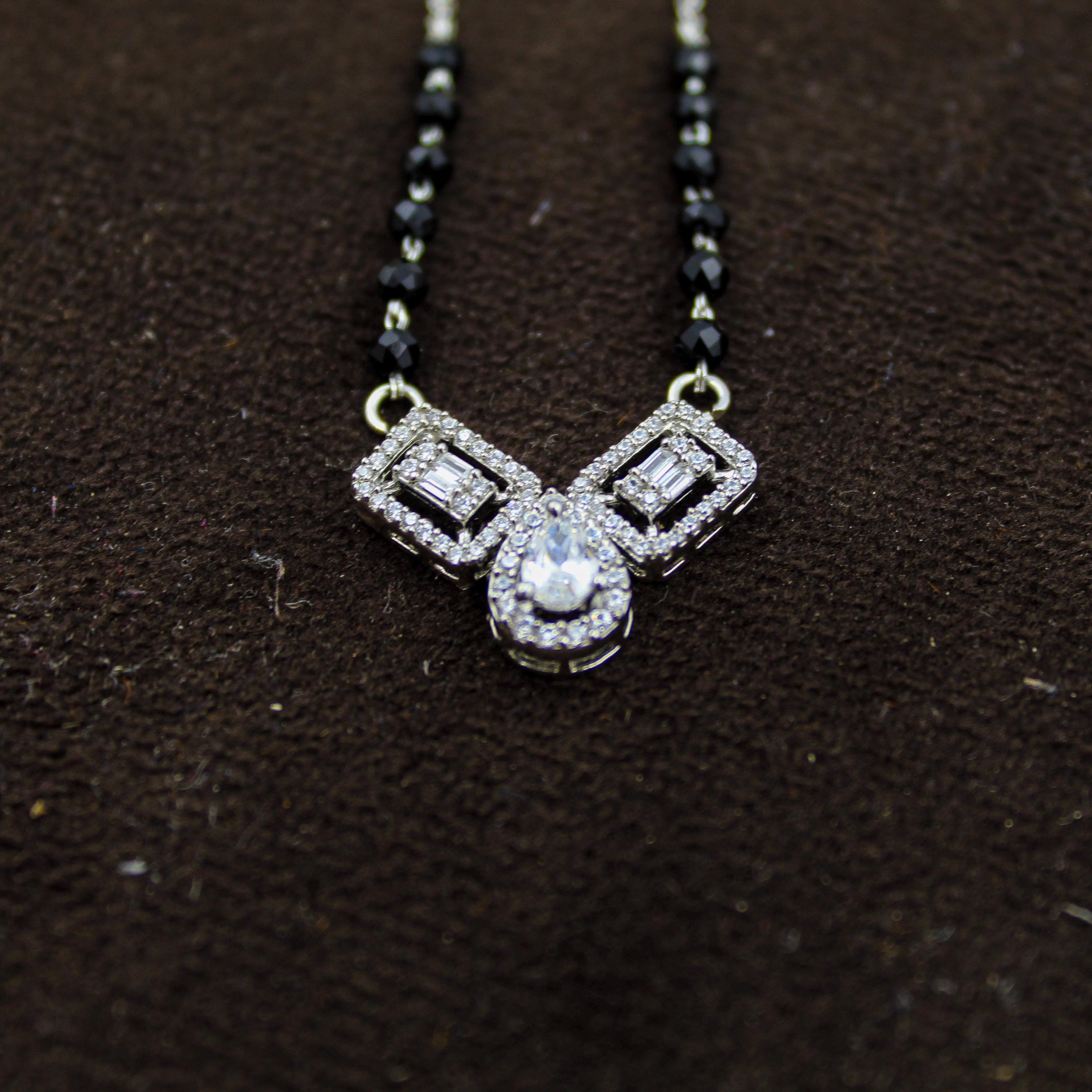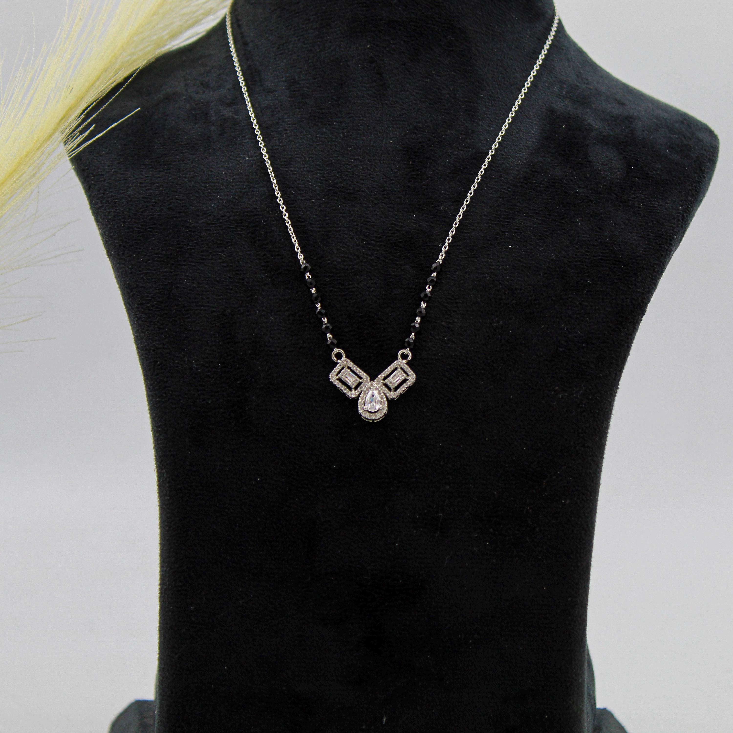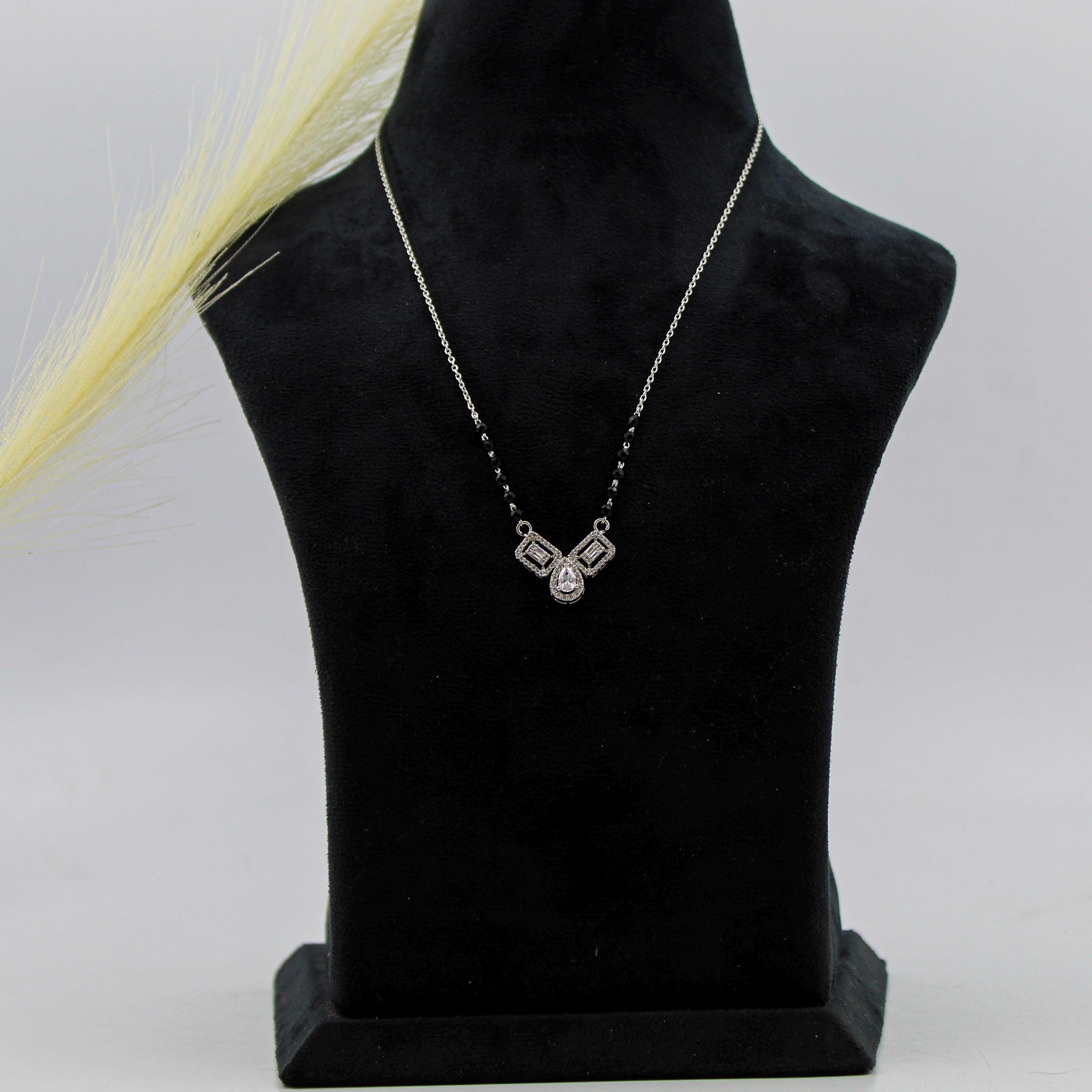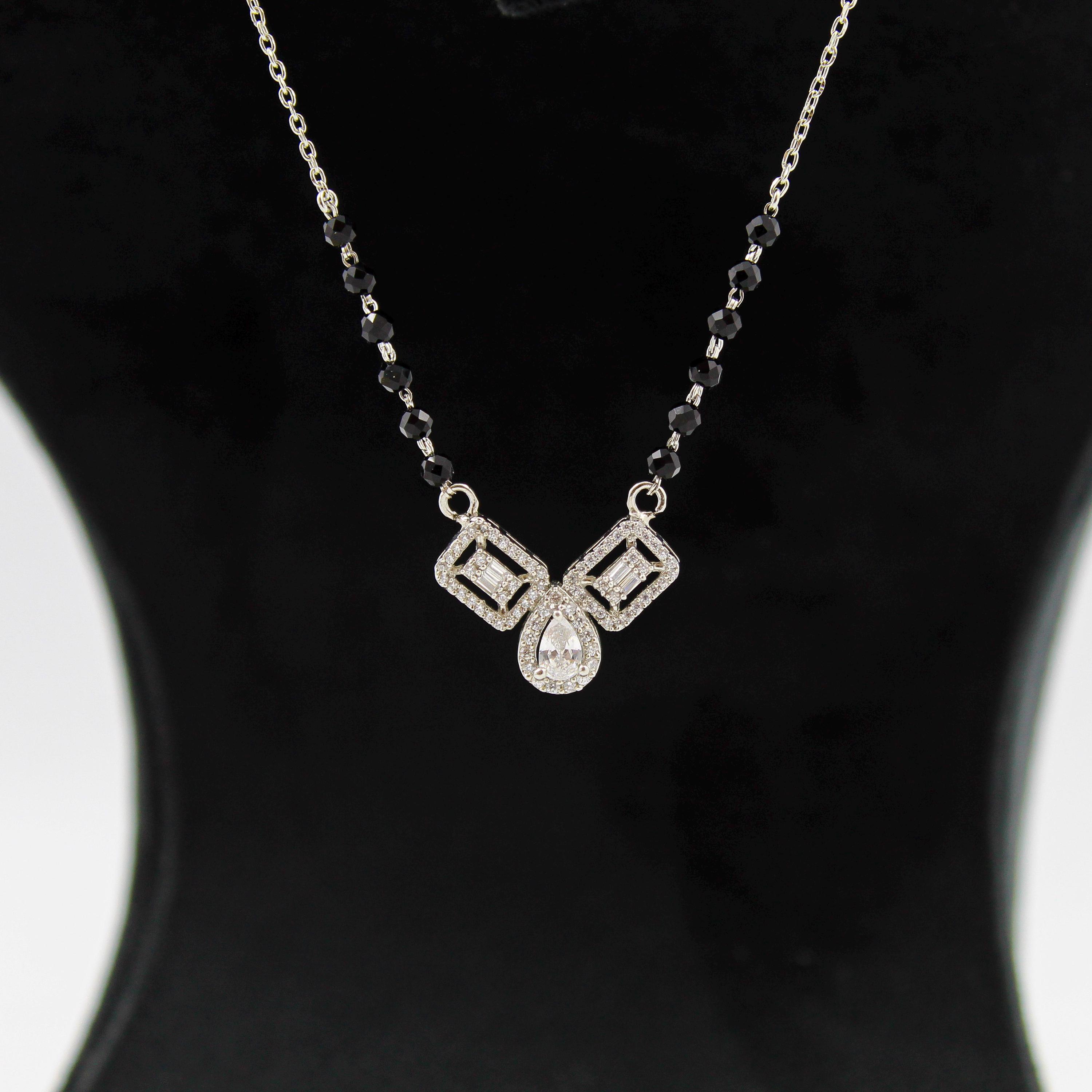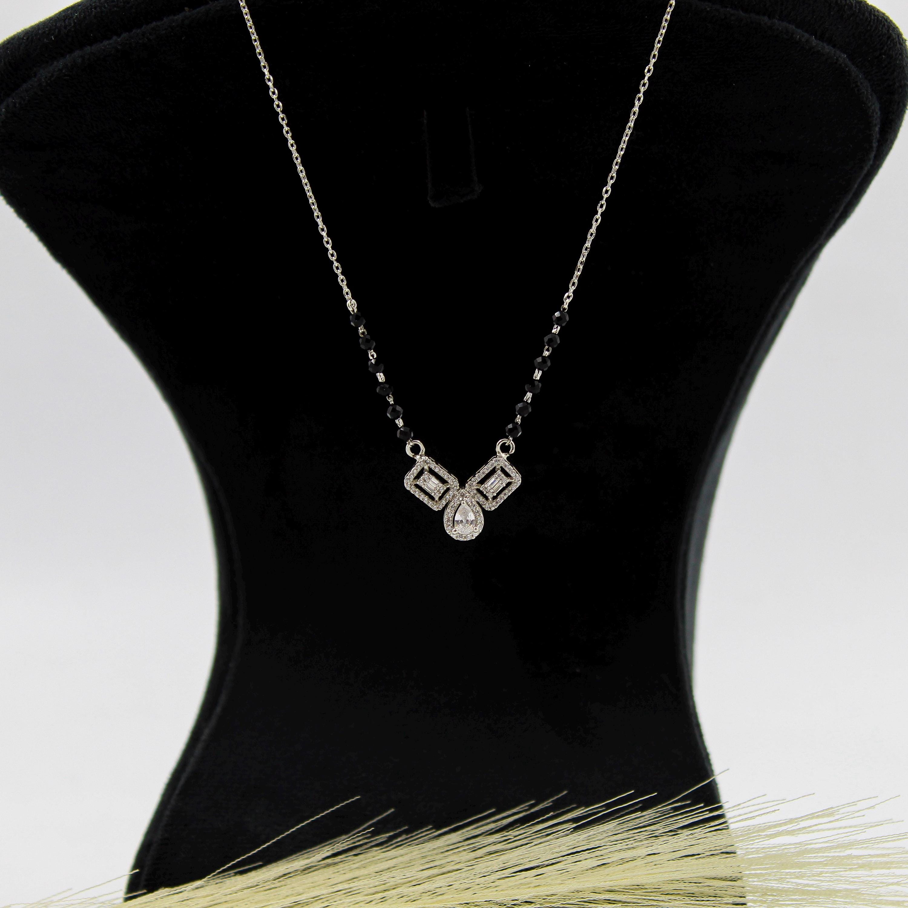 Mangalsutra Necklace, Black Beads with CZ Pendant (Minimalist Silver Tone)