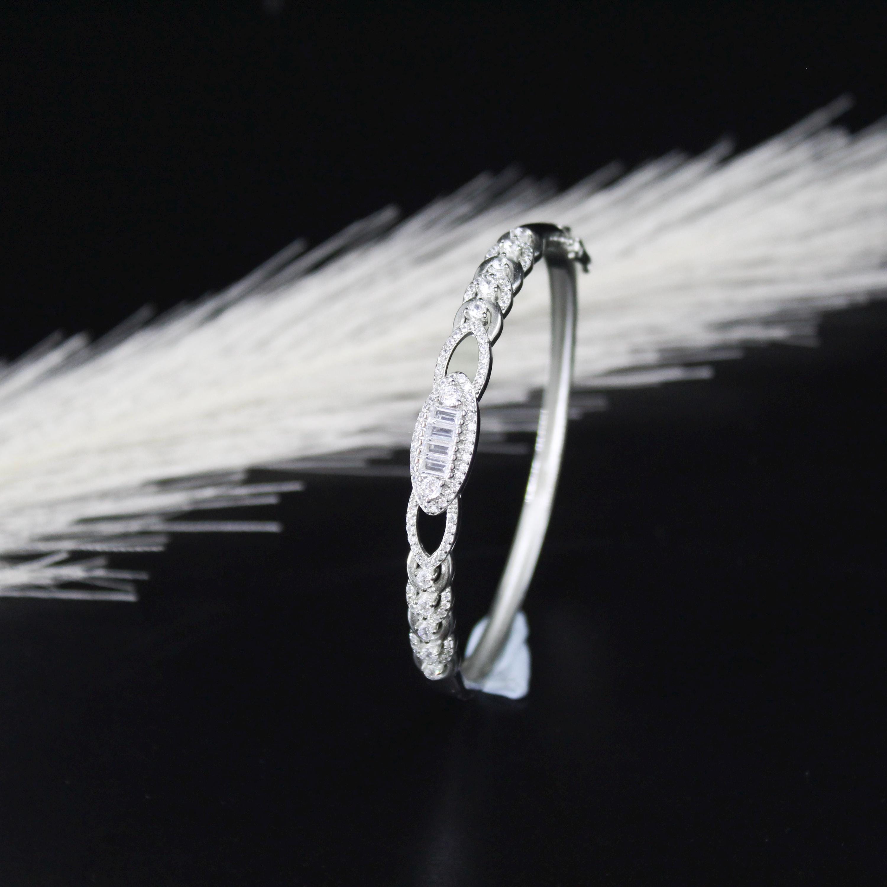 Discover the perfect blend of elegance and comfort with this sterling silver bangle bracelet, designed for women who cherish minimal luxury style and timeless beauty. Featuring a dazzling baguette cut cubic zirconia centerpiece surrounded by sparkling round cut stones, this bracelet adds a refined sparkle to any outfit. Whether you're seeking a wedding jewelry gift or a meaningful gift for her, this piece offers lasting shine and sophistication.