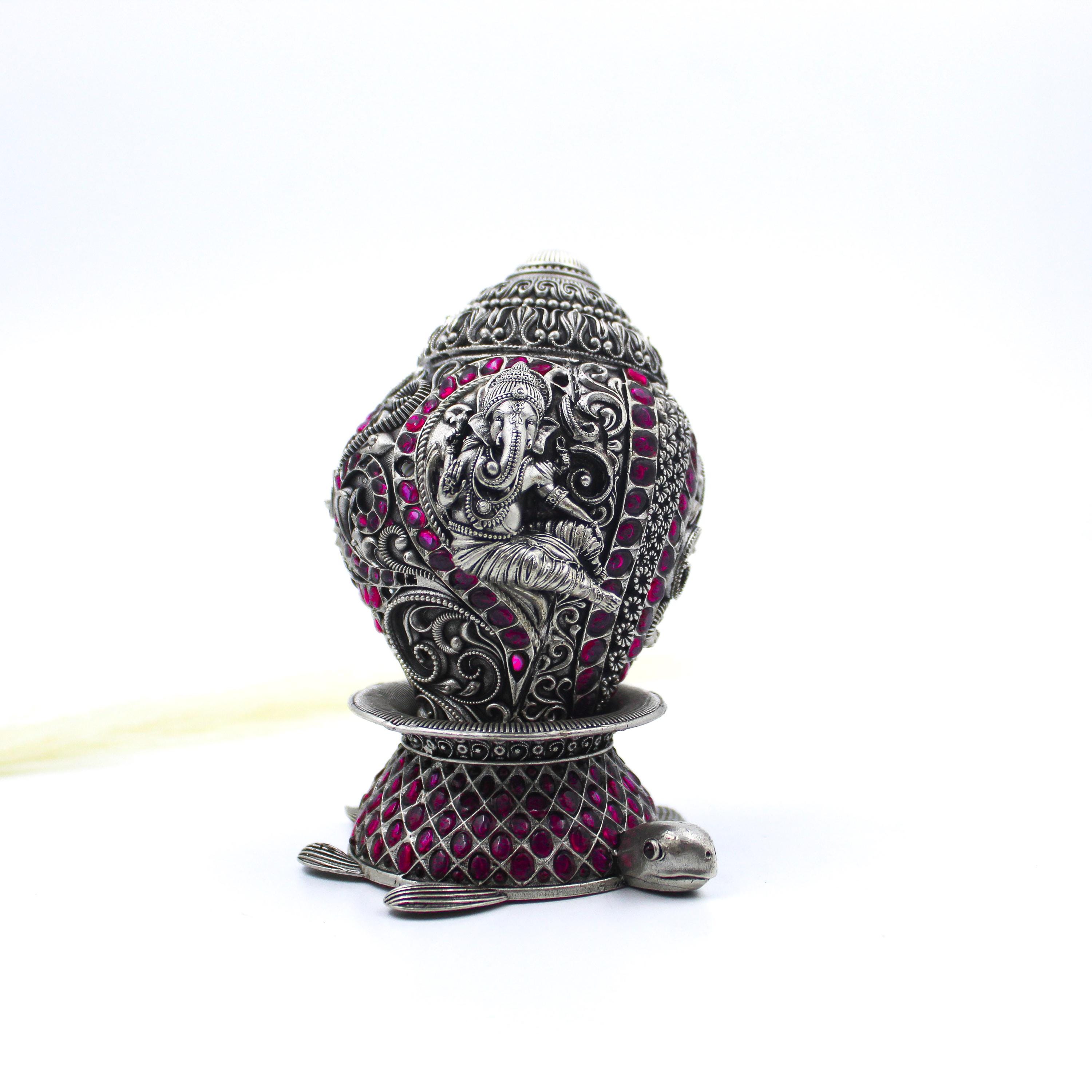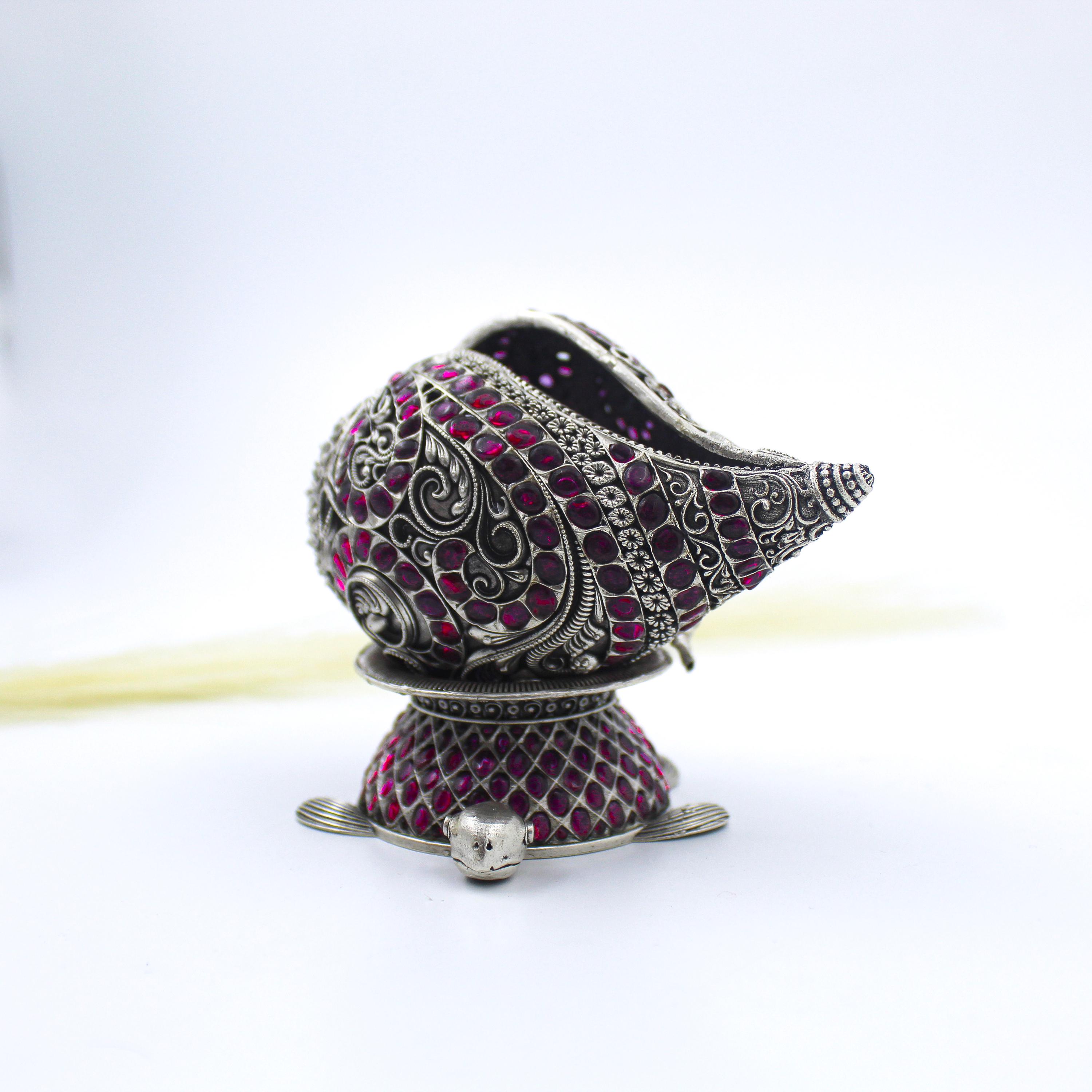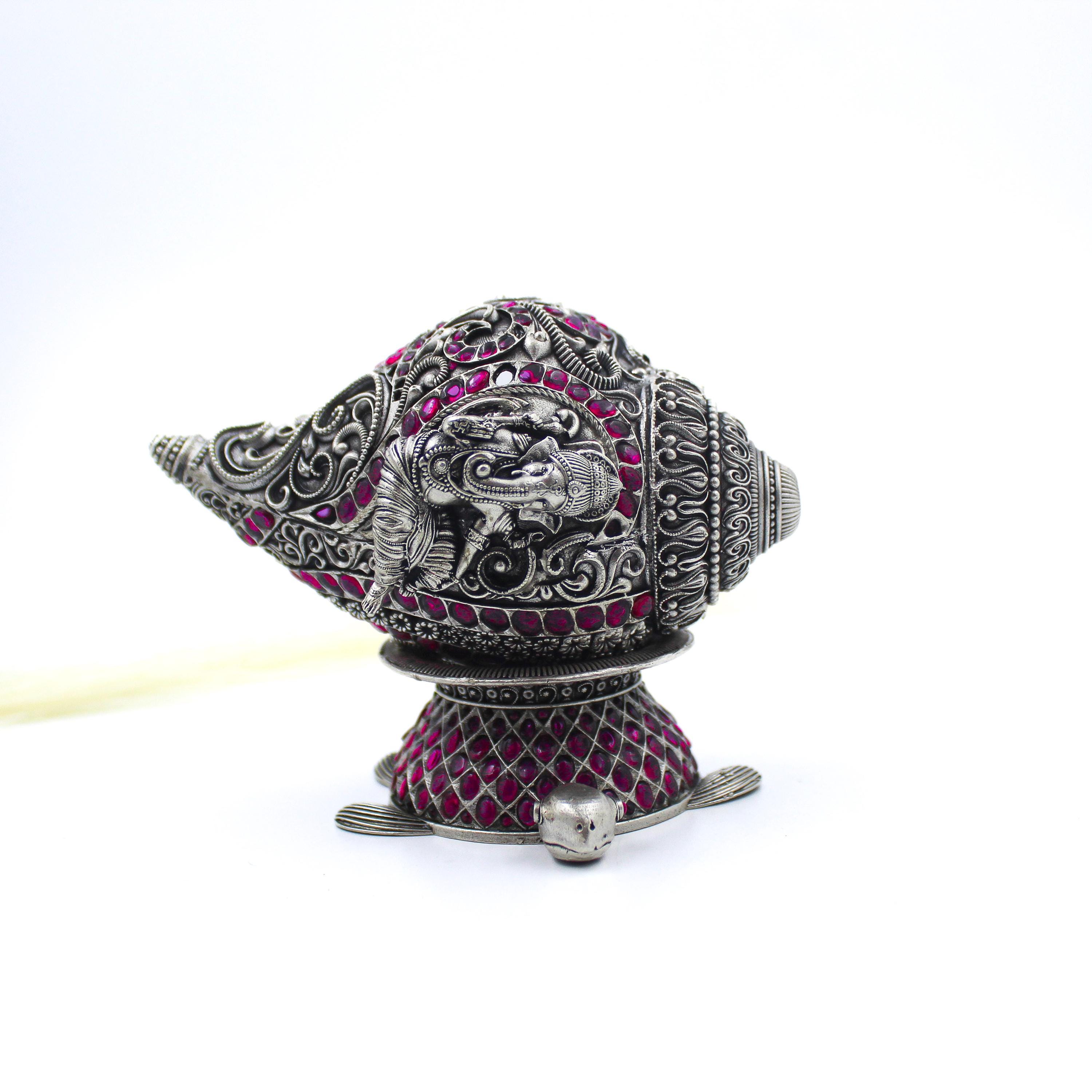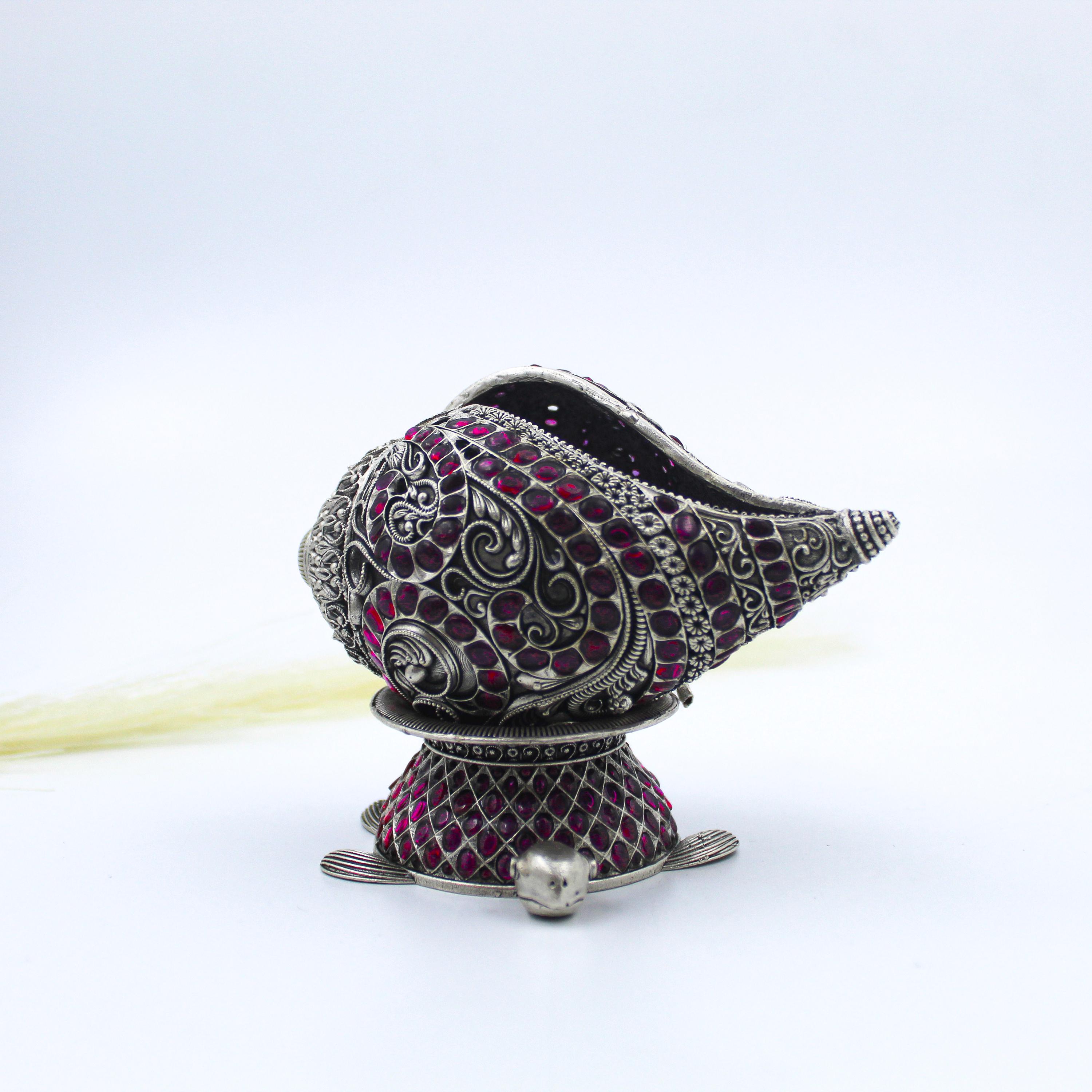 925 Sterling Silver Shank Conch Shell | Handmade Indian Silver Shankh with Ruby Red Stones | Hindu Puja Decor Gift