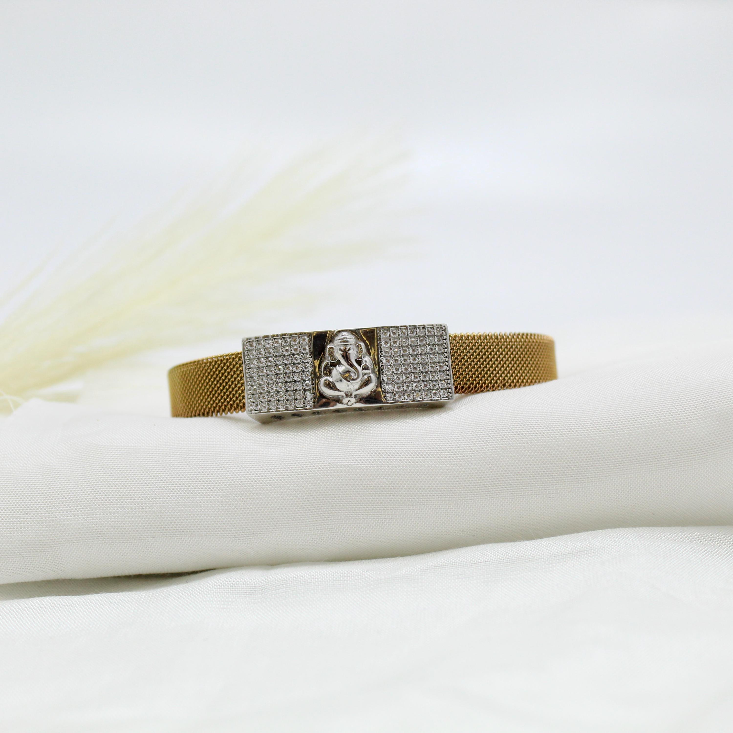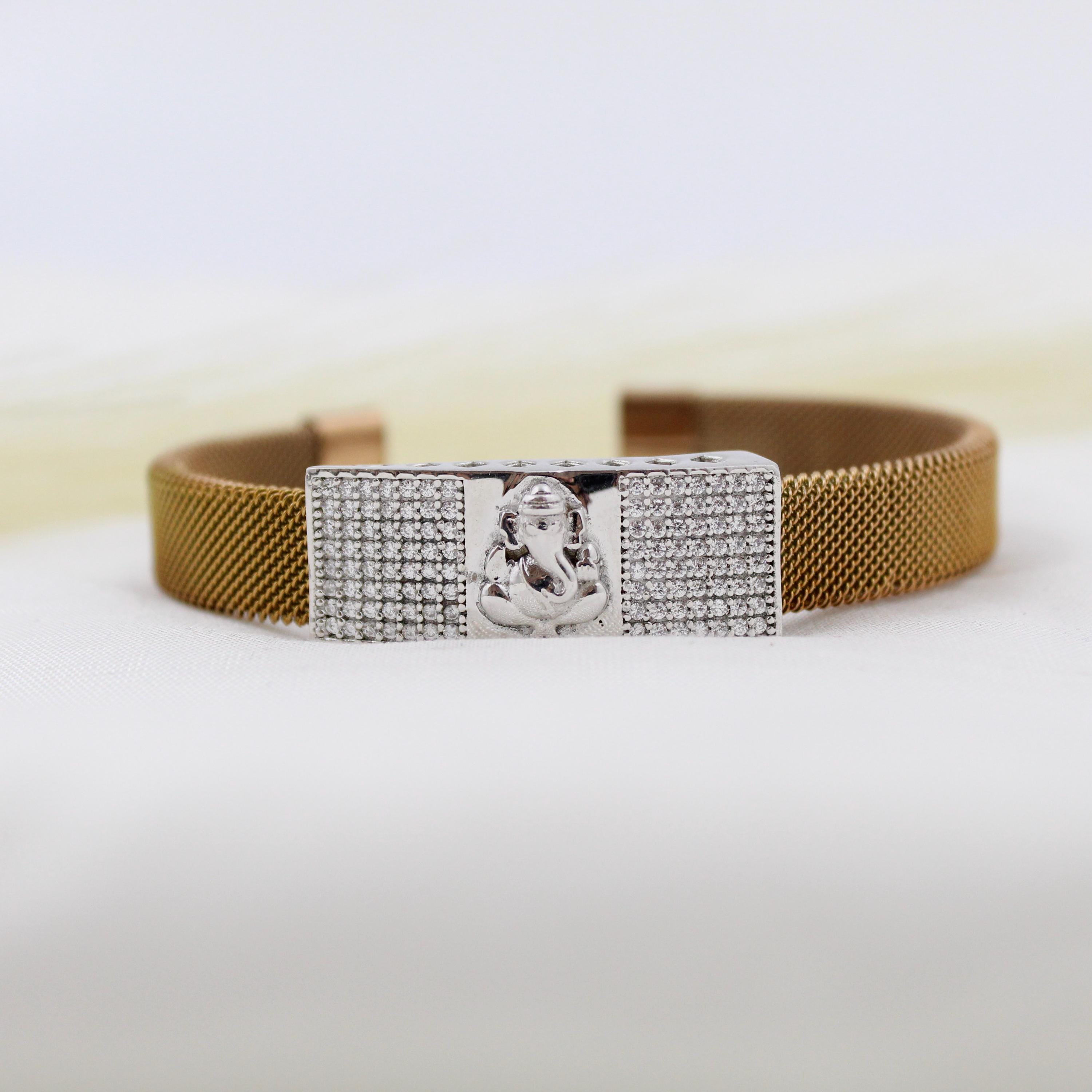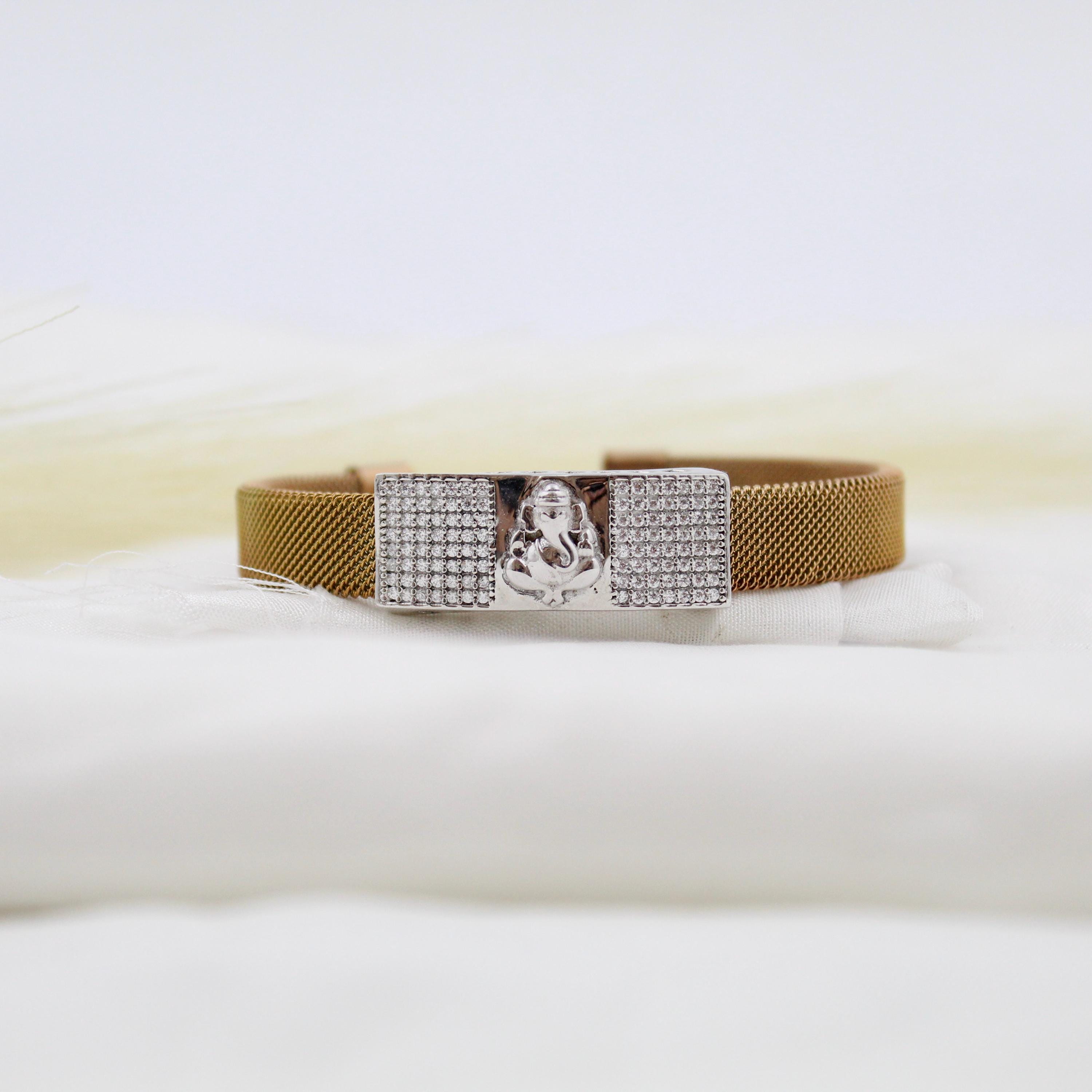 Discover a meaningful accessory that blends spirituality with style in this adjustable gold mesh bracelet, thoughtfully designed as a gift for men. Inspired by the revered Hindu god Ganesha, this bracelet features a sterling silver charm accented with sparkling crystal CZ stones, making it a perfect choice for occasions like Diwali or Raksha Bandhan. Whether you're searching for a men's spiritual gift or a unique piece to elevate everyday wear, this gold mesh bracelet offers both elegance and significance.